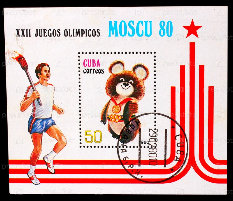 Куба, марка 1980 года, Олимпийские игры (1980), человек несет факел с огнем и медведь
