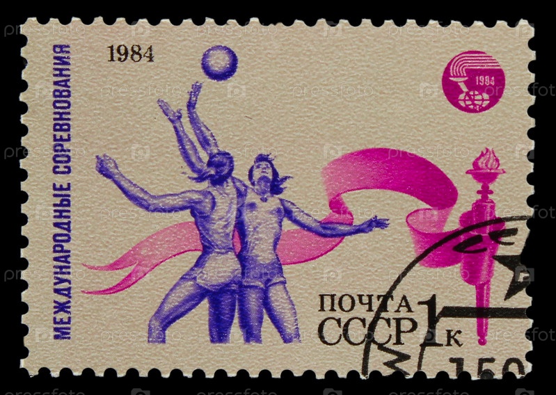 Марка СССР 1984 года. Международные соревнования, волейбол, две спортсменки играют в волейбол