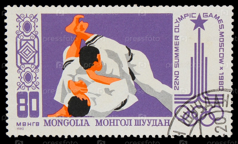 Монгольская марка 1980 года. Олимпийские игры в Москве 1980 года, дзюдо, борьба двух спортсменов