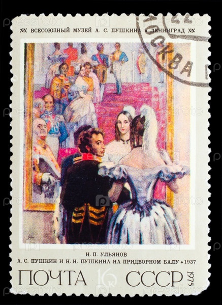 Советская марка 1975 года. Картина художника Ульянова, русский поэт Александр Пушкин и его жена Наталья на балу