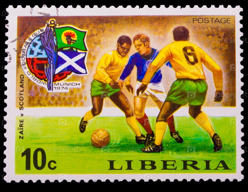 Либерийская марка 1974 года. Матч Шотландия против Бразилии, Кубок мира по футболу в Мюнхене, Германия
