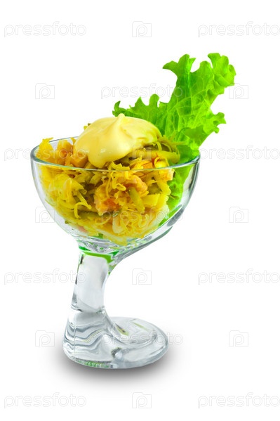 Салат из чипов и соленого сыра в стеклянном бокале на белом фоне с обтравочным контуром
