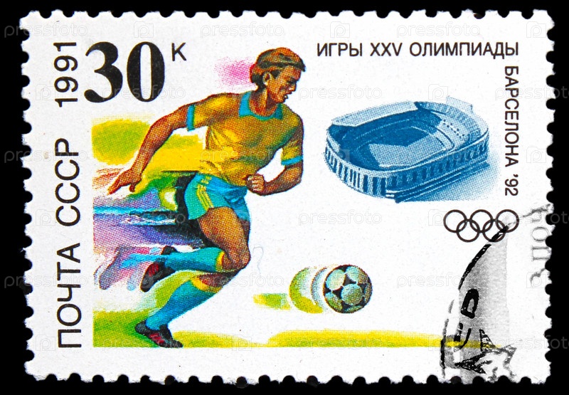 Марка СССР 1991 года. футбол, Олимпийские игры в Барселоне, игрок ударяет по мячу