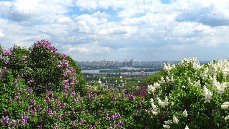 Вид на город Киев с кустами сирени