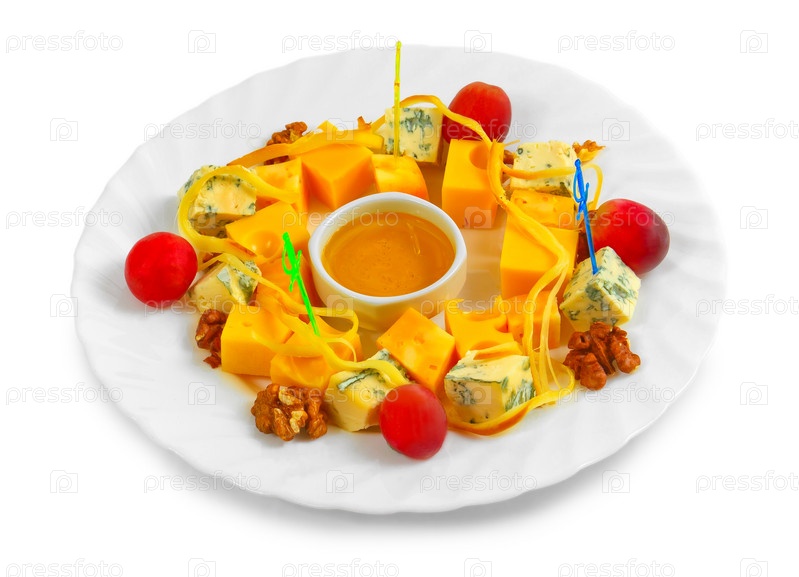 Сырная закуска с медом, орехи и виноград на тарелке, изолированные на белом фоне