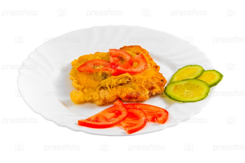 Мясо на гриле, сыр и помидоры, изолированные на белом фоне
