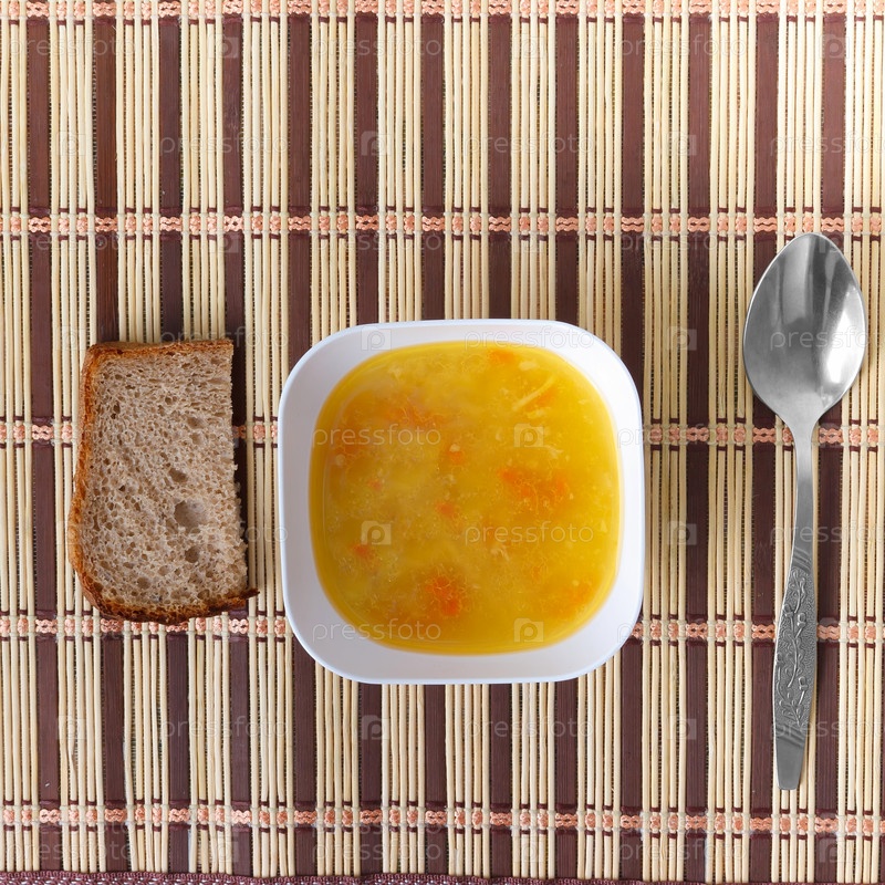 Тарелка супа с ложкой и хлеб