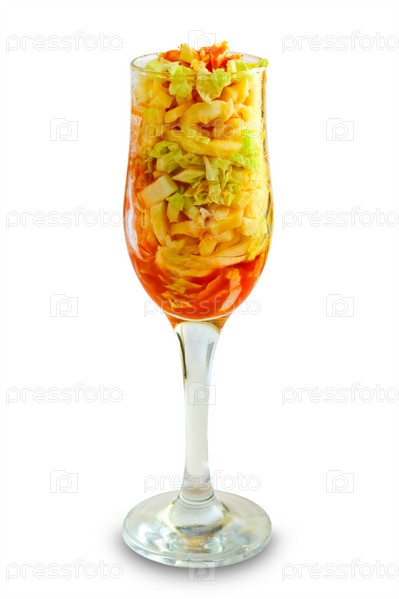 Капуста и жареный картофель фри с томатным соком в бокале на белом фоне