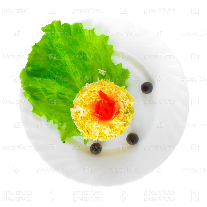 Свежий салат с оливками, рисом, яйцом, огурцами и помидорами на белом фоне