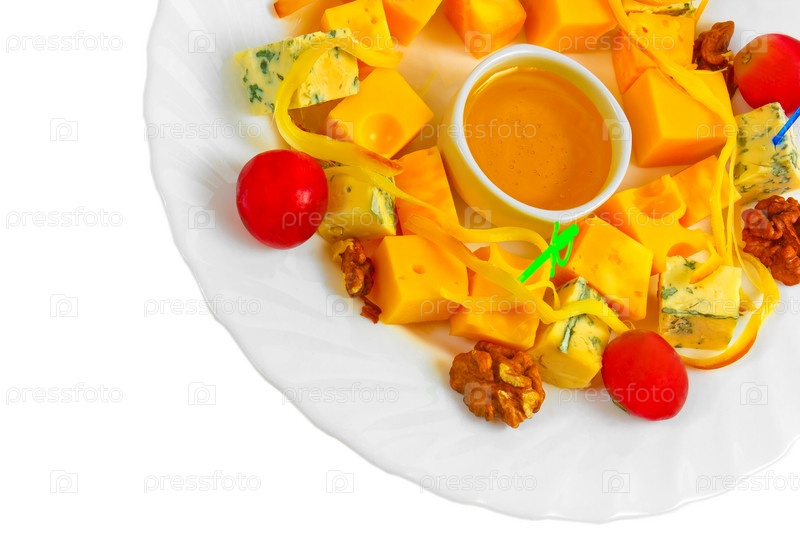Сырная закуска с медом, орехами и виноградом на тарелке