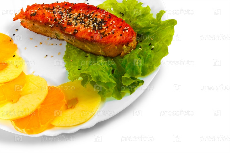 Жареный лосось, ананас и листья салата на тарелке, изолированной на белом фоне