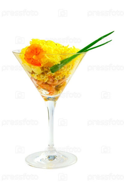 Свежий салат с сыром, грибами, луком и креветами на белом фоне (путь отсечения)
