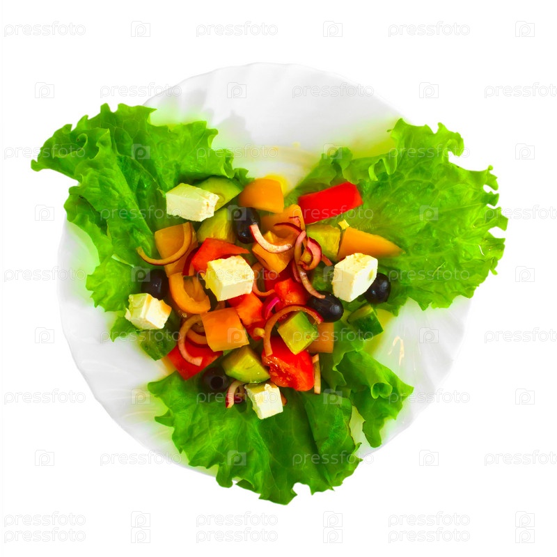 Салат из свежих томатов, огурцов и перца с сыром и зеленью на белом фоне