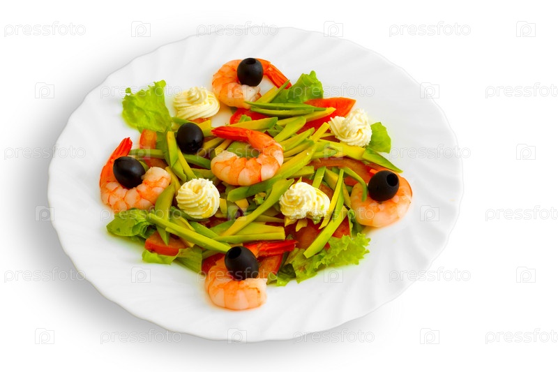 Свежий салат с креветками, оливками и сливками на белом фоне (путь отсечения)
