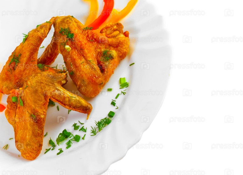 Жареные куриные крылышки с нарезанным перцем, луком и укропом на тарелке на белом фоне