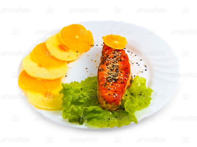 Жареный лосось, ананас и листья салата на тарелке, изолированной на белом фоне
