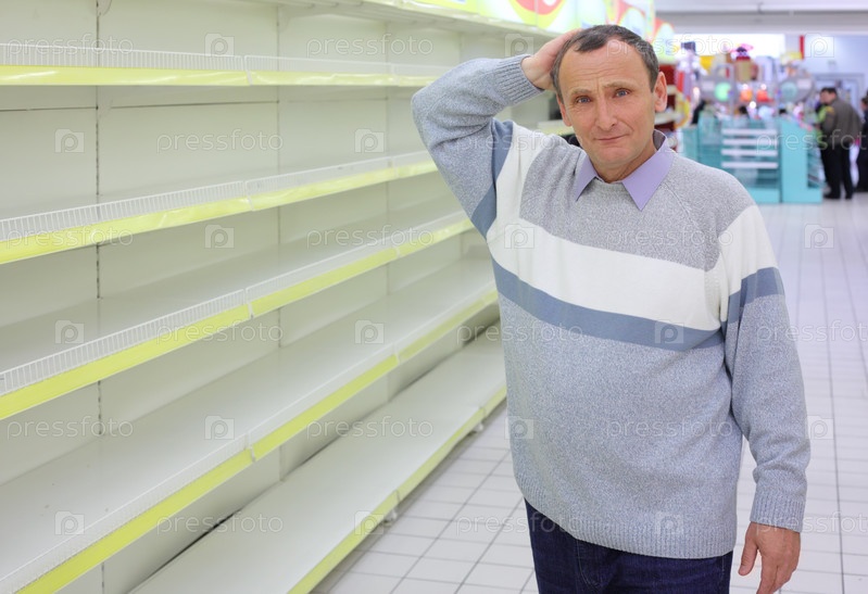 Пожилой человек стоит между пустыми полками в магазине, почесывая затылок