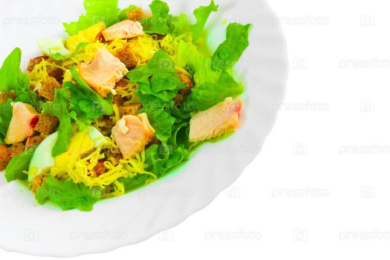 Салат с сыром, ветчиной, яйцом, жареным хлебом и зеленью на белом фоне