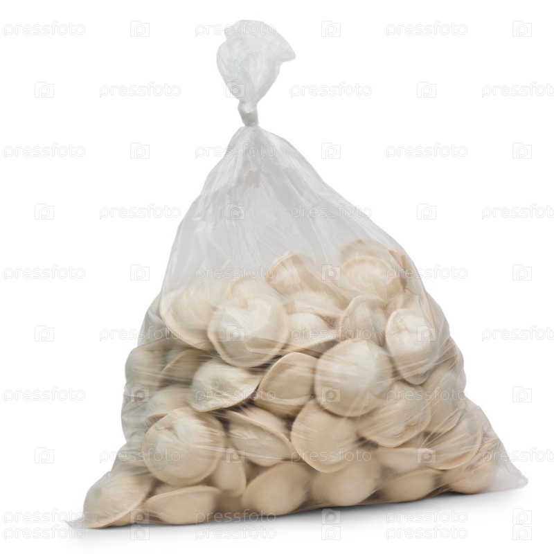 Сырые пельмени в целлофановом пакете на белом фоне