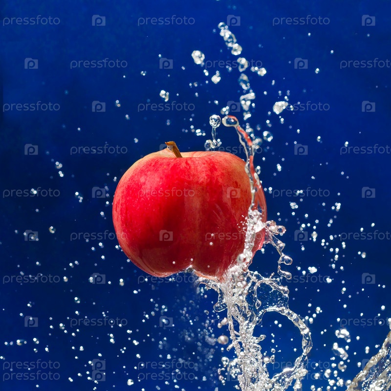 Красное яблоко в синей воде с пузырьками