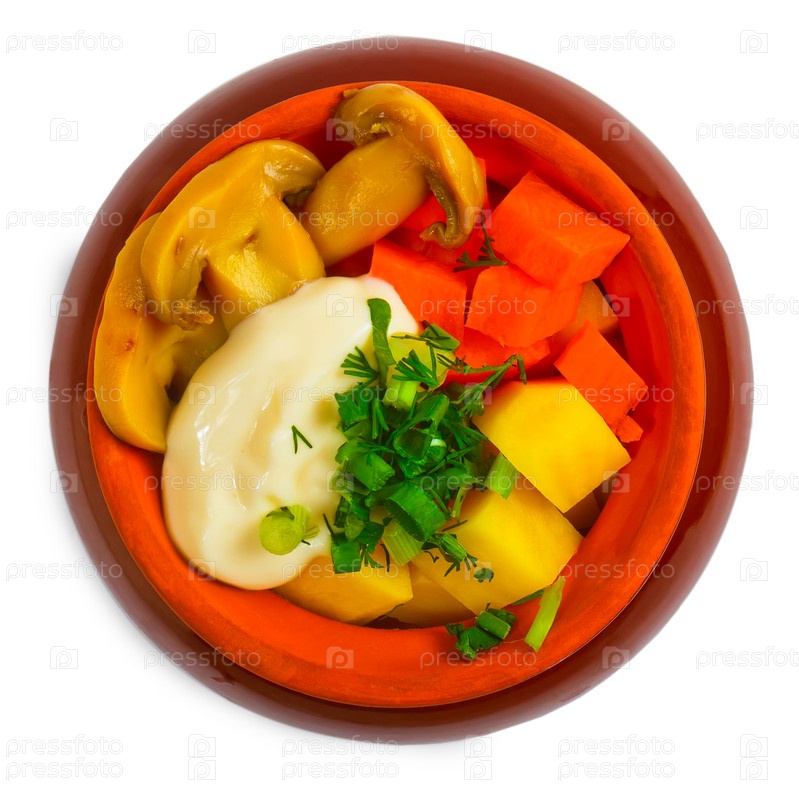 Картофель, тушеное мясо, грибы, морковь и лук в керамическом горшке, изолированные на белом фоне
