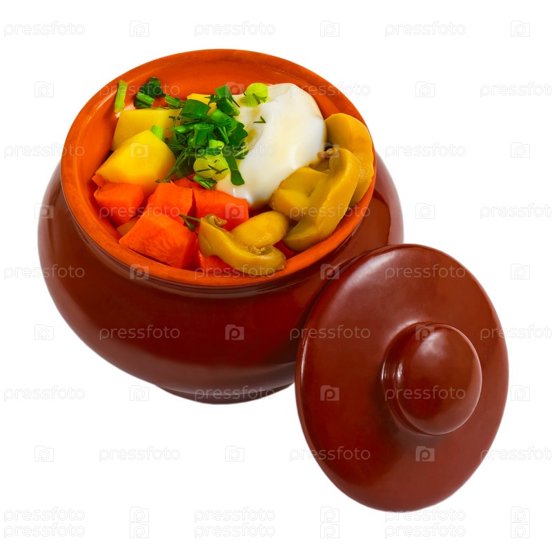 Тушеный картофель с мясом, грибами и морковью, изолирован на белом фоне