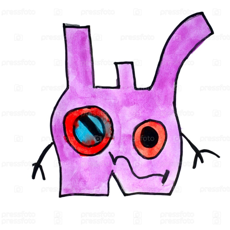 Злой монстр, акварельный изолиованный рисунок на белом фоне