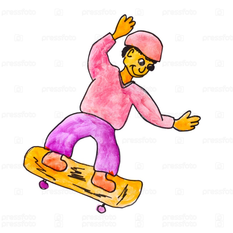 Мальчик-скейтбордист, акварельный изолиованный рисунок на белом фоне