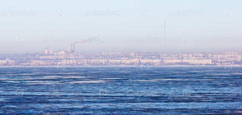Город у моря и русская зима со льдом и снегом