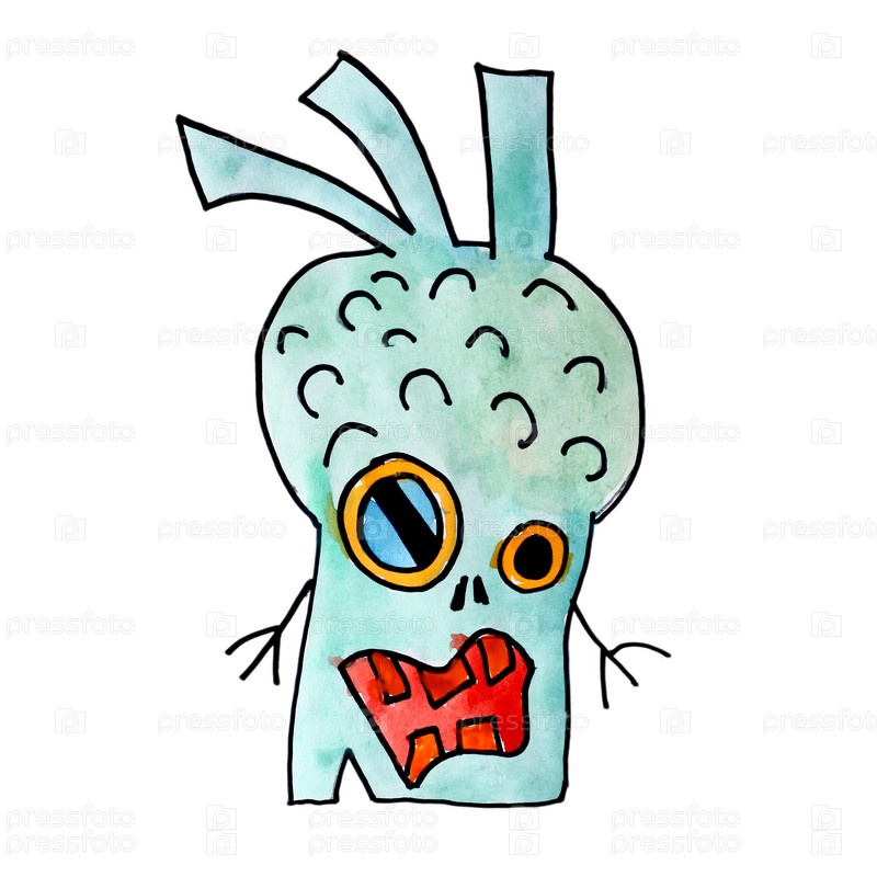 Злой монстр, акварельный изолиованный рисунок на белом фоне
