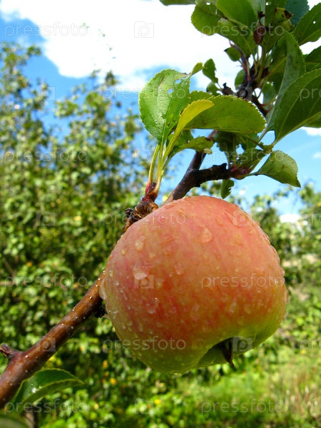 Спелое яблоко с каплями воды
