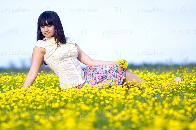 Красивая темноволосая девушка, лежащая на поле желтых цветов