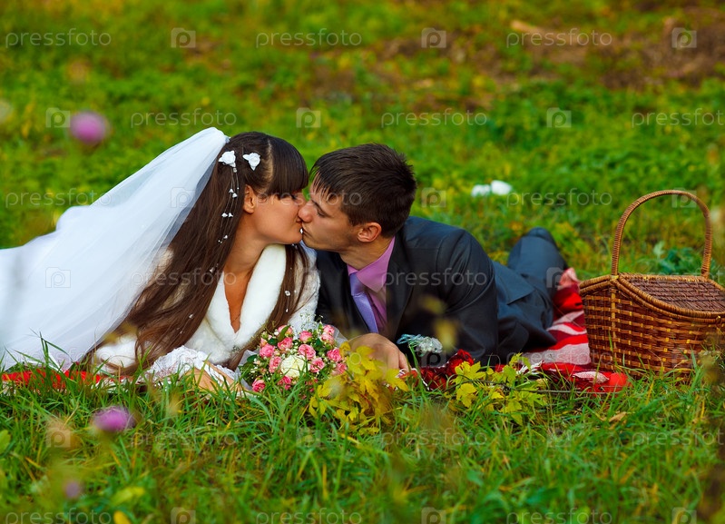 Невеста и жених лежат на траве на пикнике в осеннем парке
