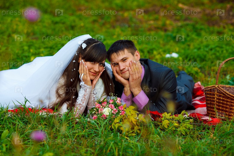 Невеста и жених лежат на траве на пикнике в осеннем парке
