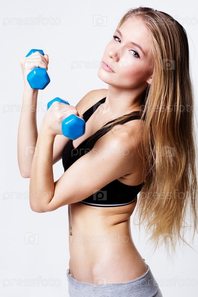 Спортивная женщина занимается с гантелями