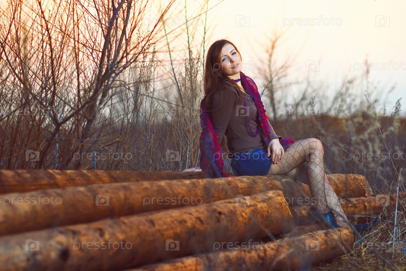 Брюнетка сидит на бревнах на фоне сухой травы на закате