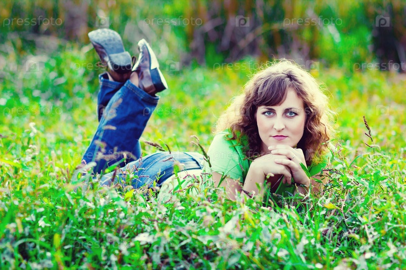 Девушка с вьющимися волосами в джинсах и футболке лежит на зеленой траве