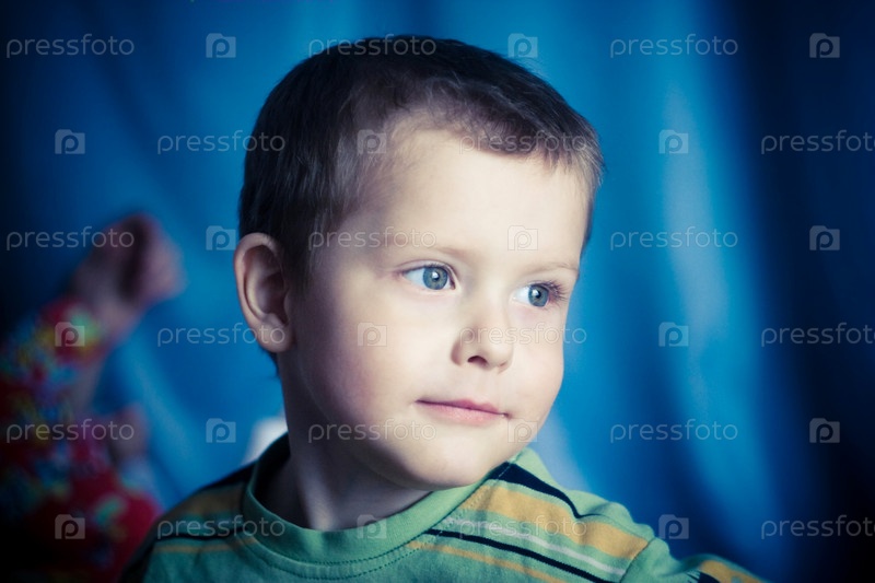 Мальчик с голубыми глазами на синем фоне смотрит в сторону
