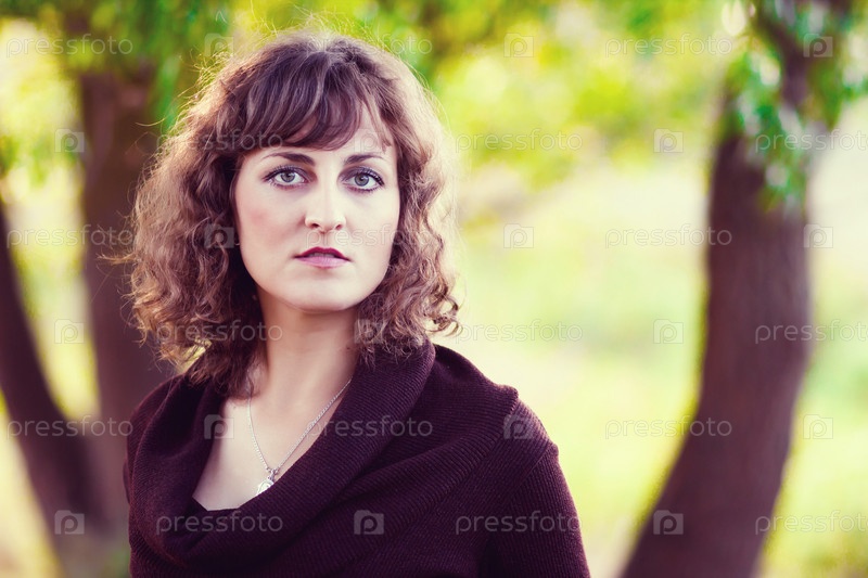 Девушка с вьющимися волосами в коричневый платье на зеленом природном фоне