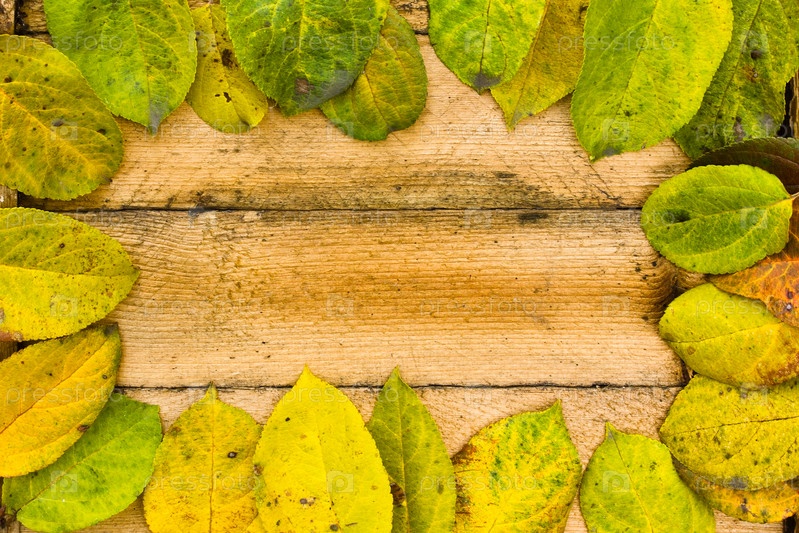 Осенние желтые листья на деревянном фоне