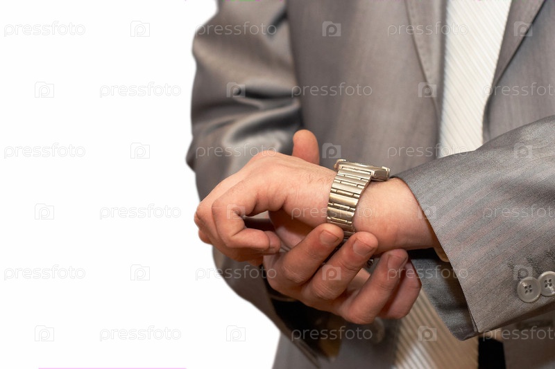 Человек, изолированный на белом фоне, смотрит на часы