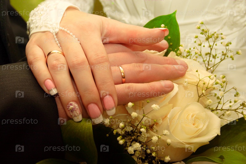 Невеста и жених положили свои руки на свадебный букет