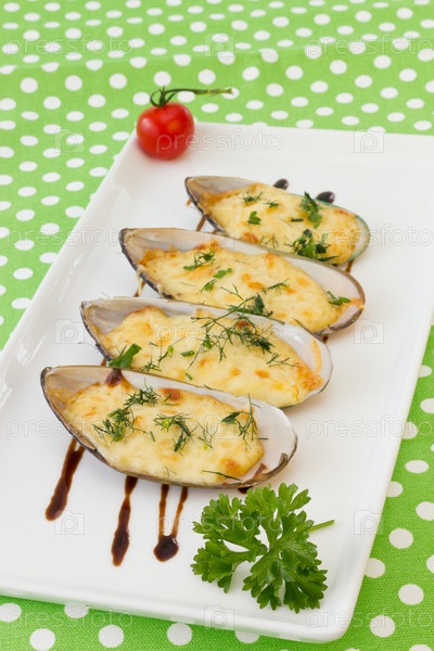 Запеченные мидии под сырным соусом, украшенные укропом, петрушкой и помидорами черри