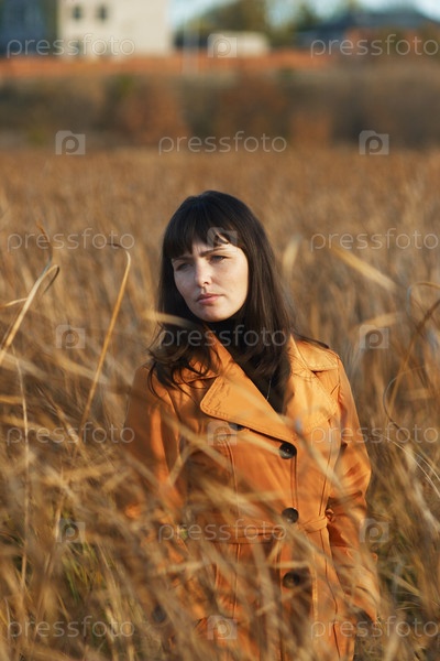 Грустная девушка в рыжем пальто поздней осенью в поле