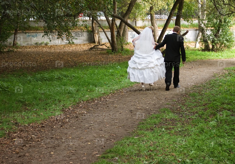 Жених и невеста гуляют по парку