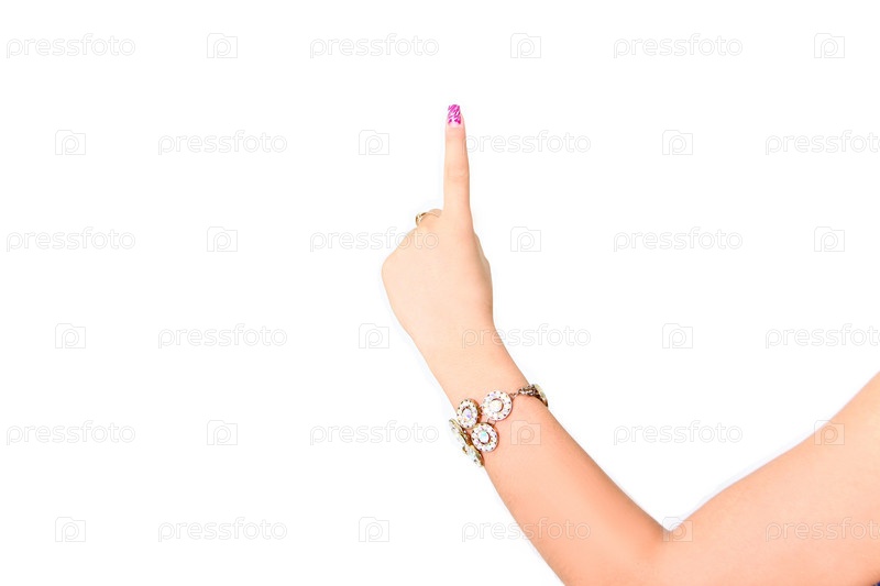 Женская рука указывает или нажимает кнопку, изолированная на белом фоне