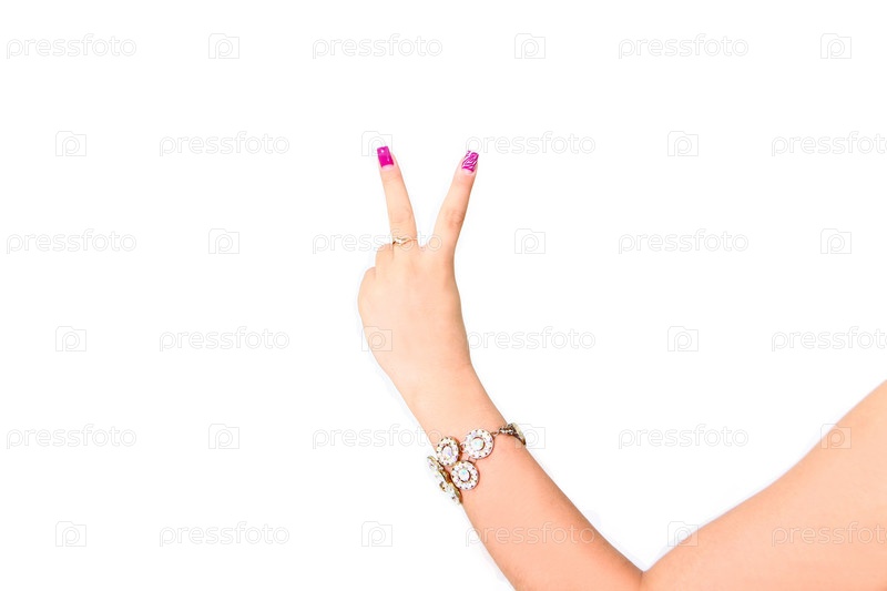 Женская рука с двумя пальцами вверх. Символ мира или победы. Изоляция на белом фоне