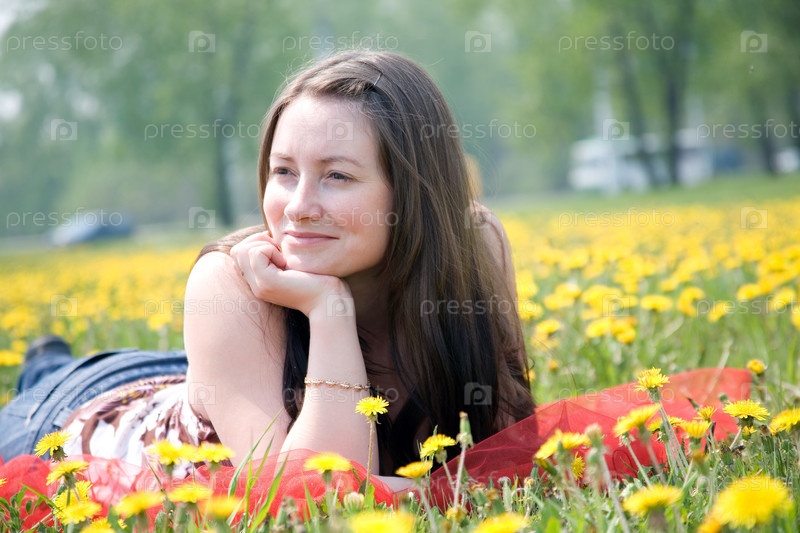 Молодая девушка лежит среди одуванчиков