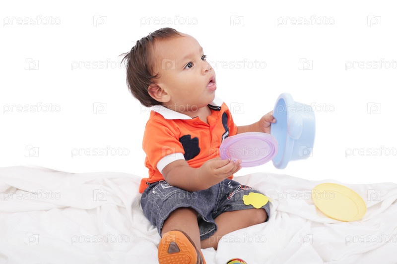 Очаровательный годовалый ребенок играет, изолированный на белом фоне
