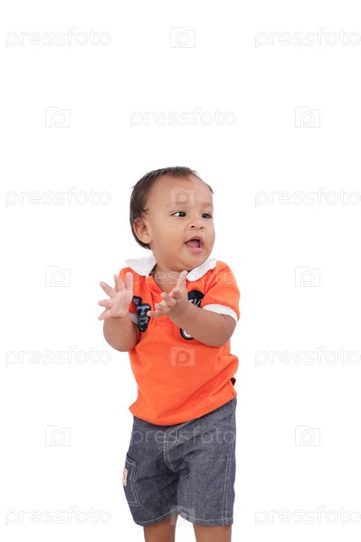 Счастливый годовалый мальчик ходит, изолированный на белом фоне